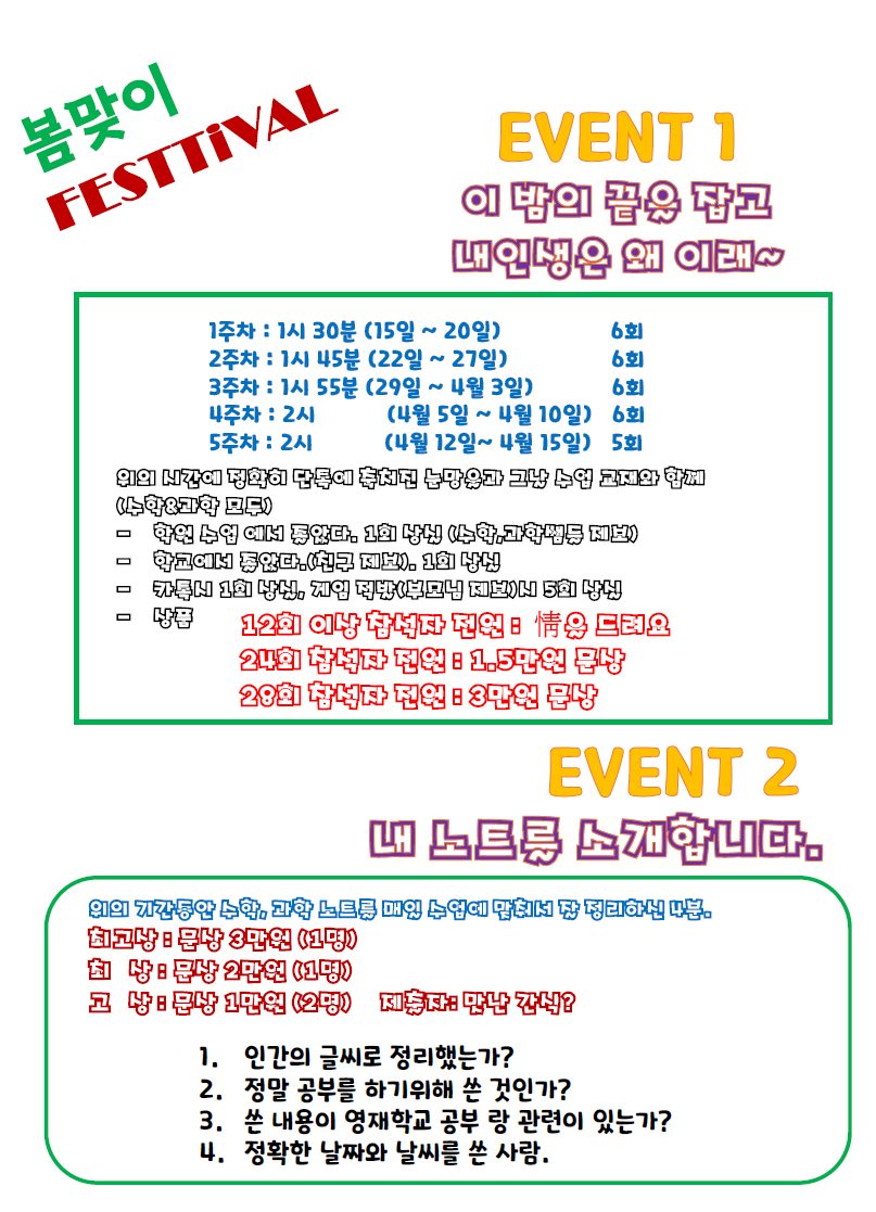 봄맞이 festival 행사 안내1주차: 1시 30분 (15일 ~ 20일)2주차: 1시 45분 (22일 ~ 27일)3주차: 1시 55분 (29일 ~ 4월 3일)4주차: 2시 (4월 5일 ~ 4월 10일)5주차 2시 (4월 12일 ~ 4월 15일)